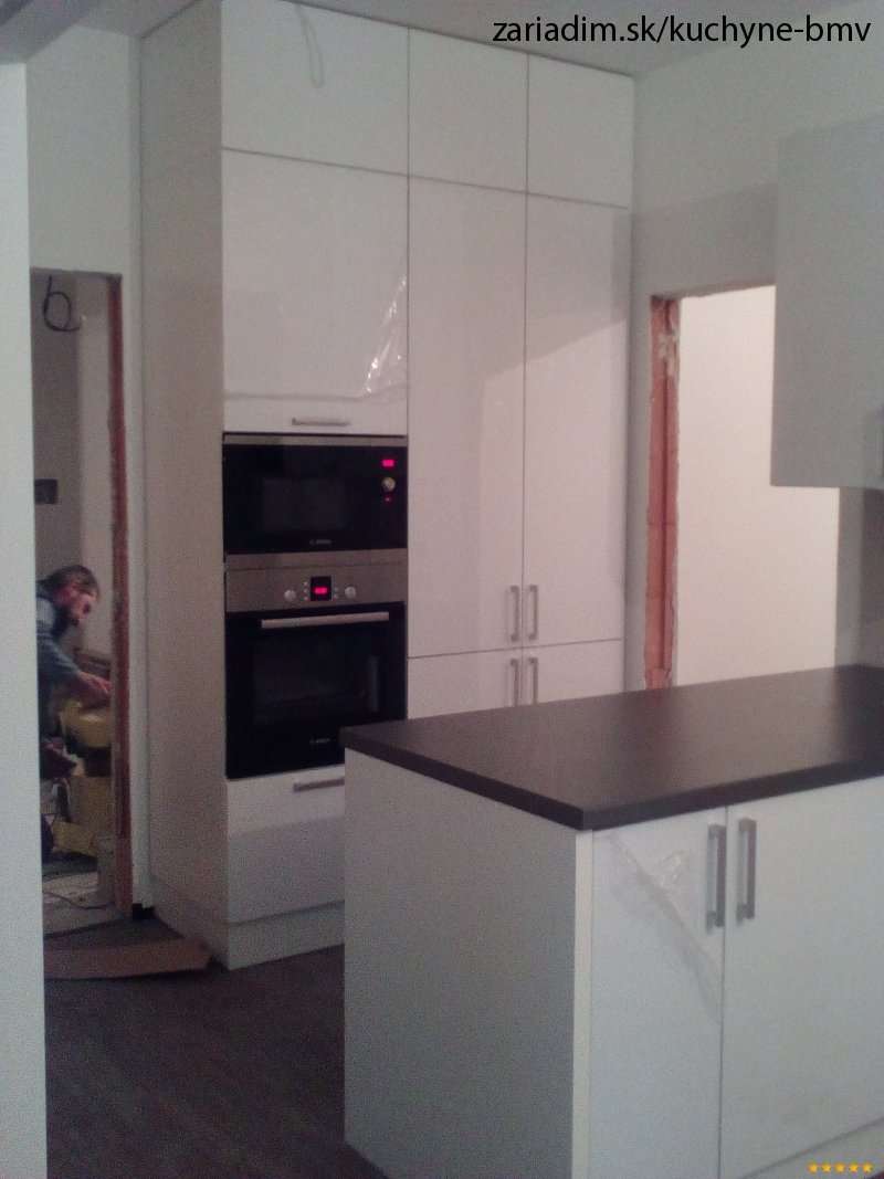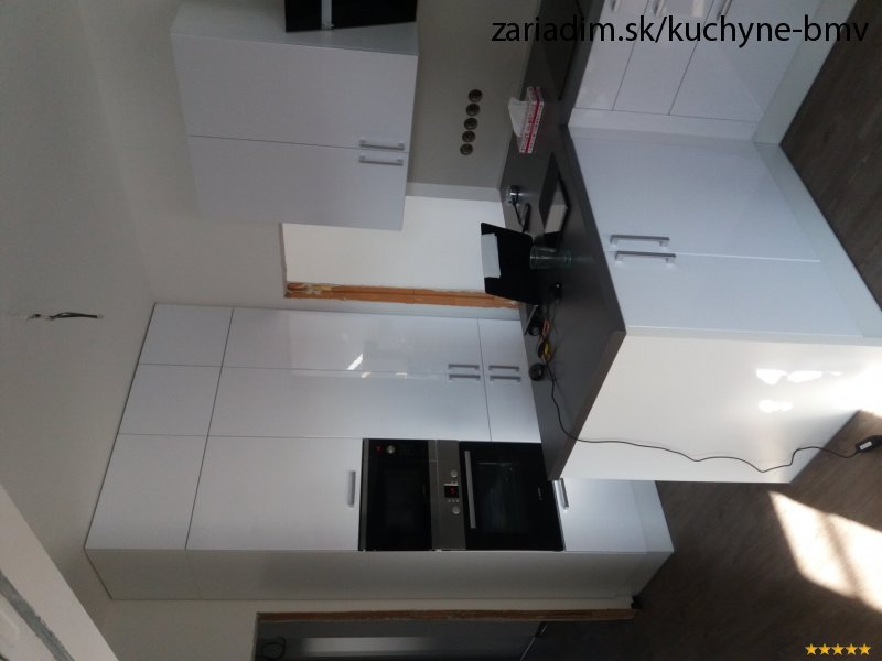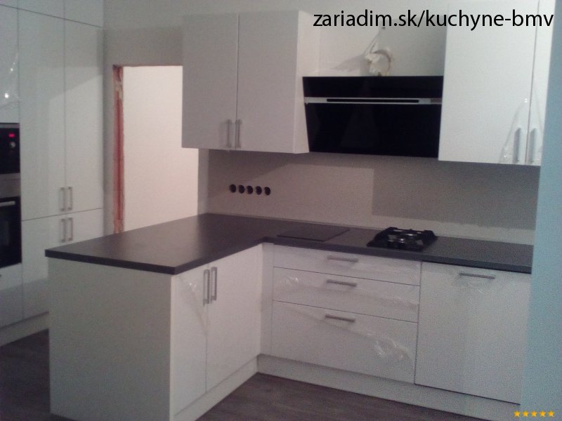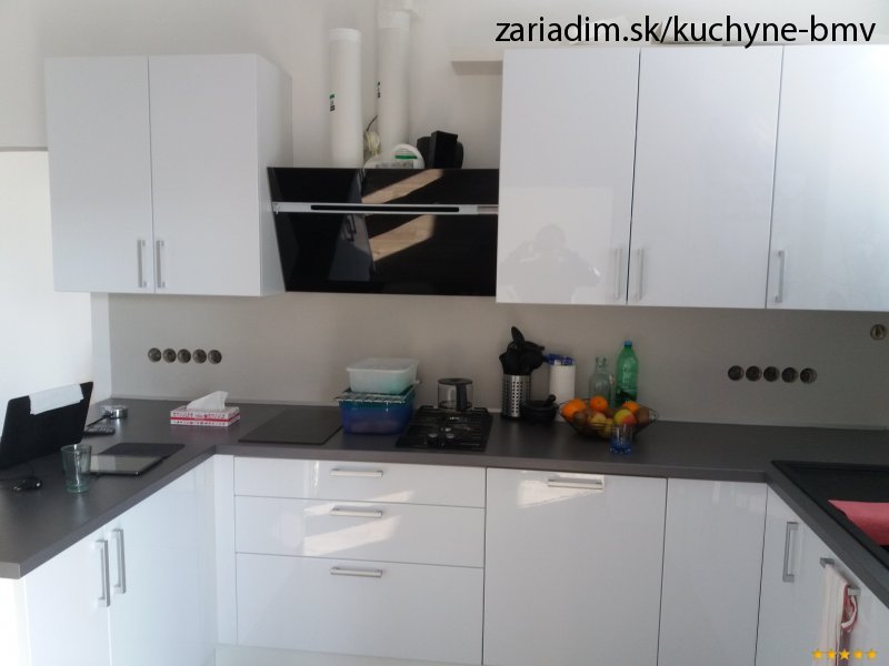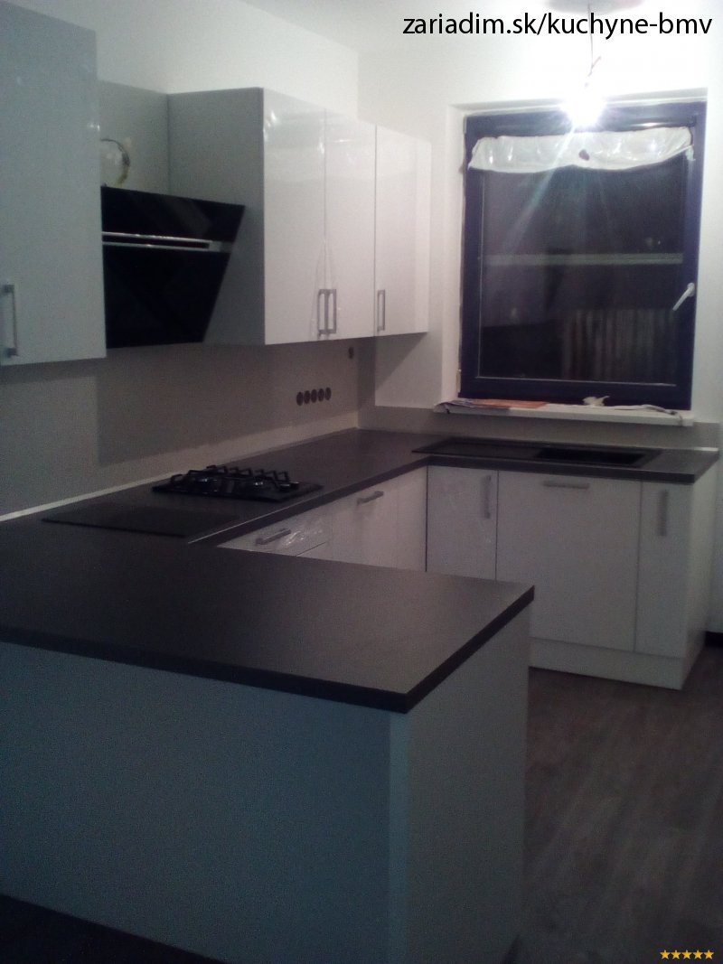 Biela lesklá kuchynská linka do domu. Čierny odsávač pár Elica. Čierna pracovná doska Egger.