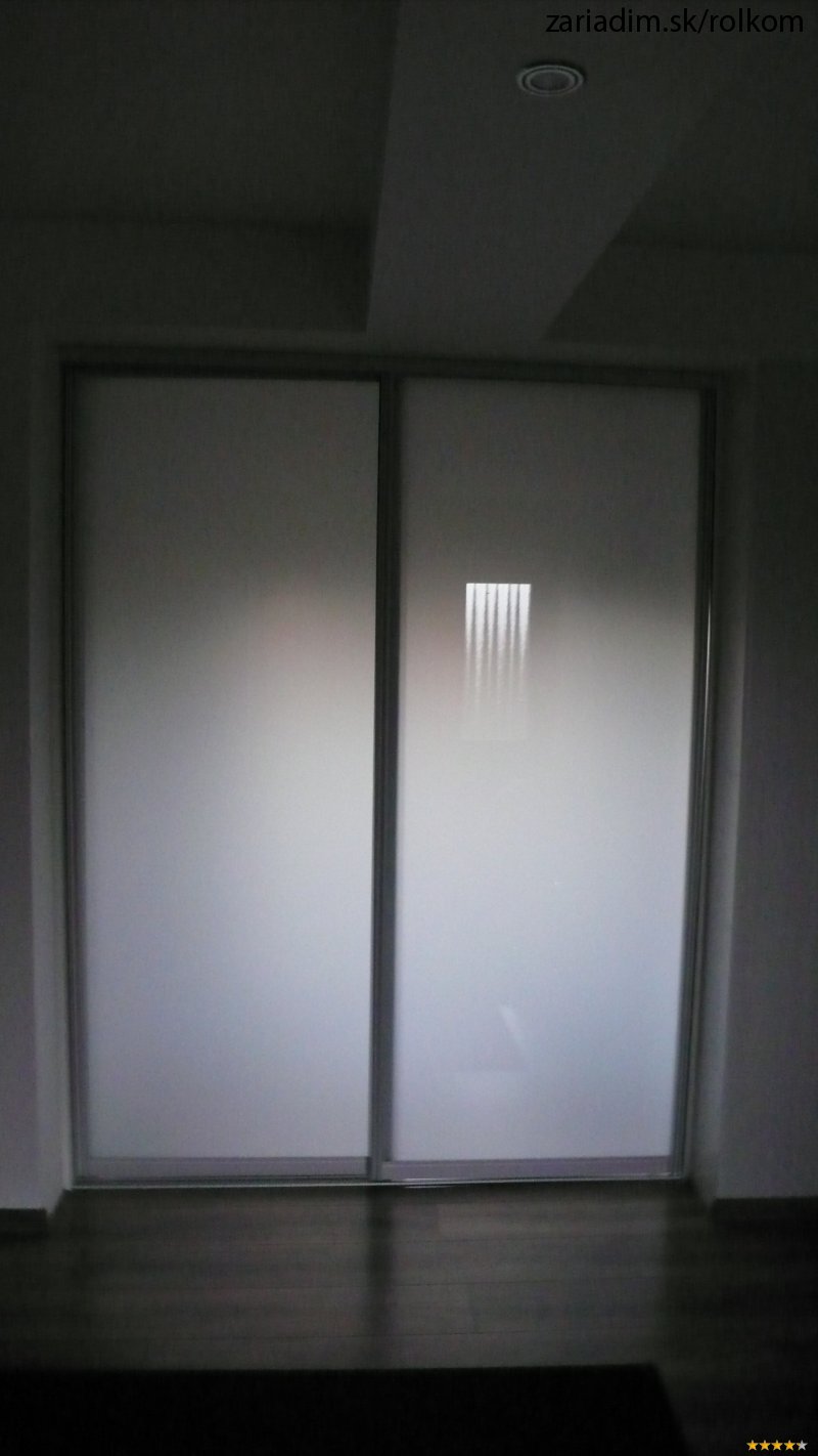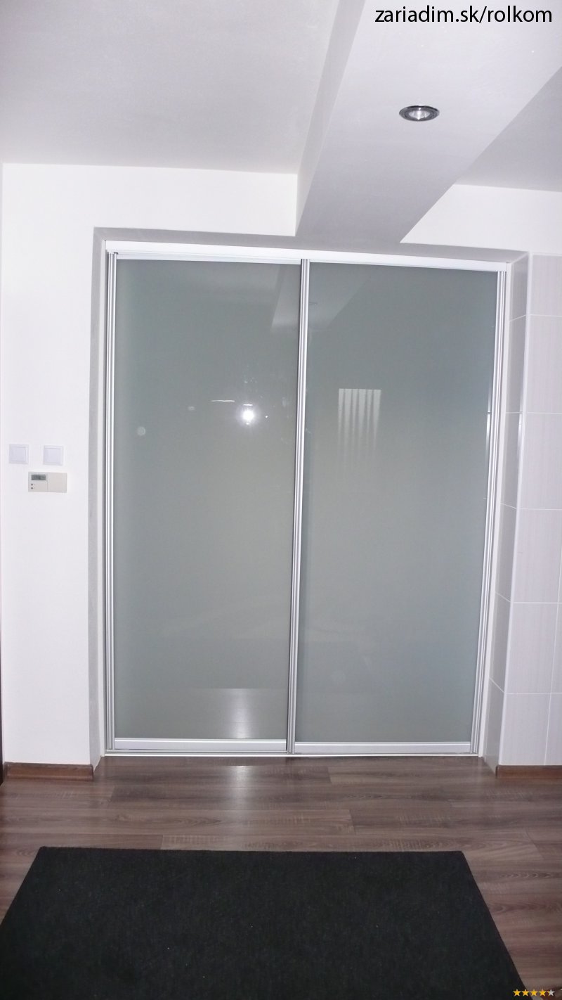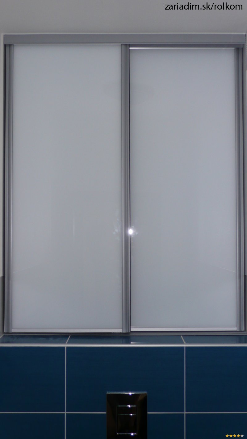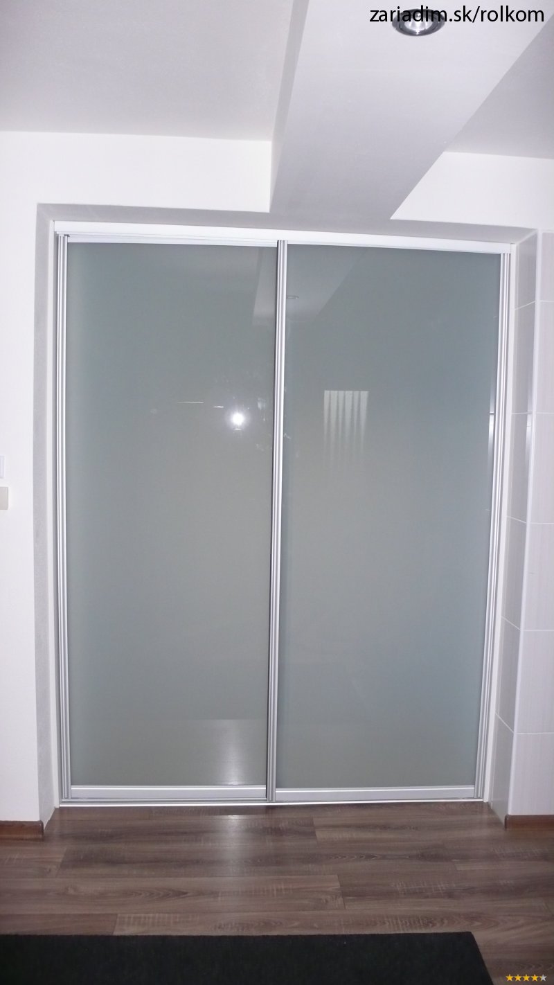 2. posuvné dvere o rozmere š 106 cm, v 80 cm. Použitý materiál Sklo Pure white 9003, rám oceľový Striebro.