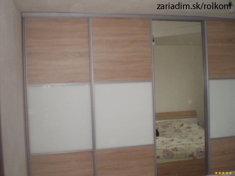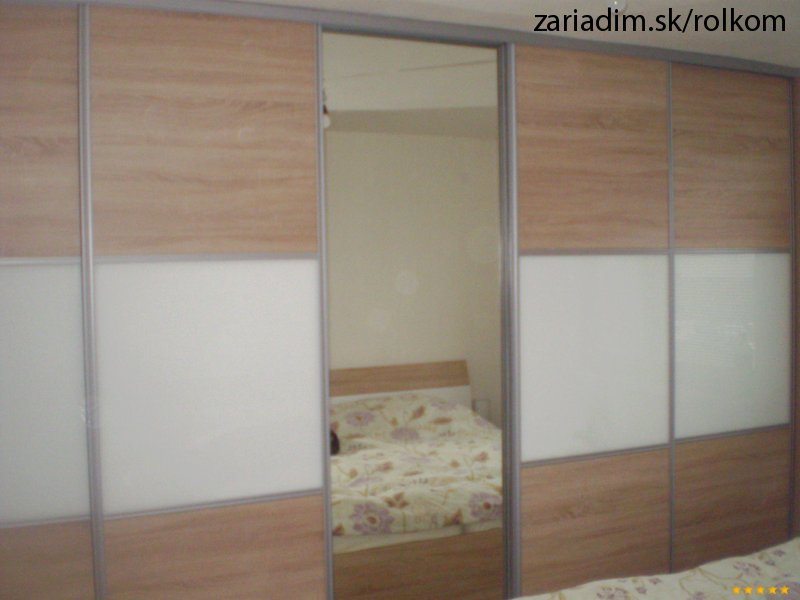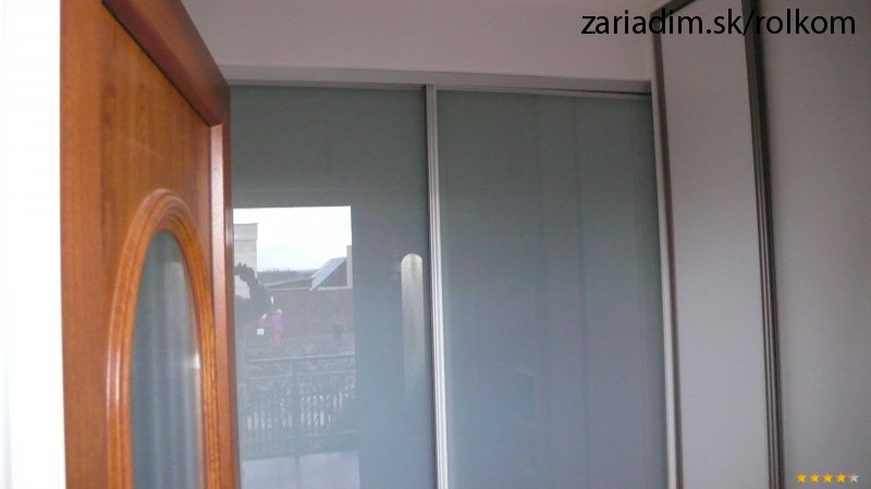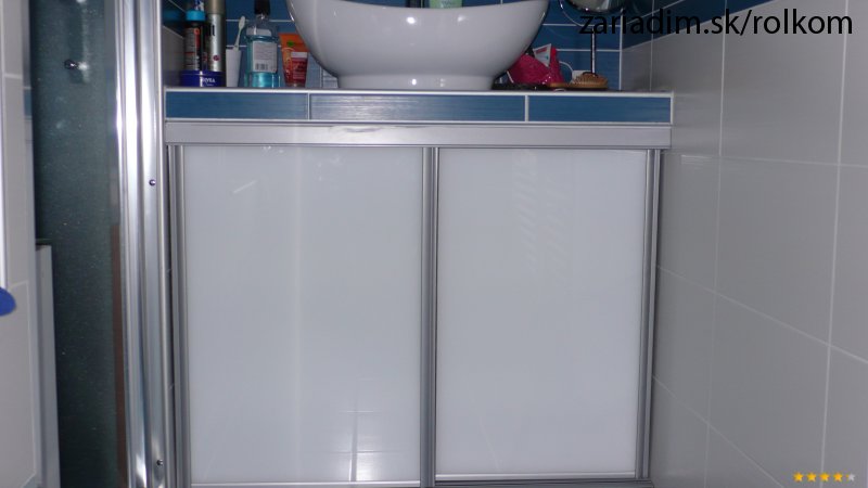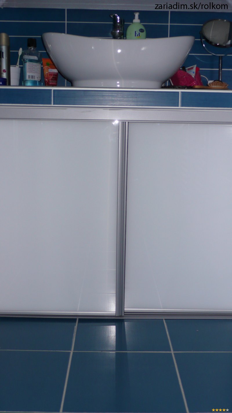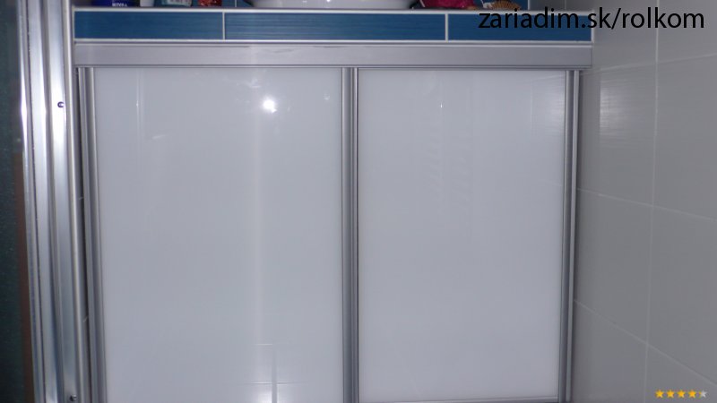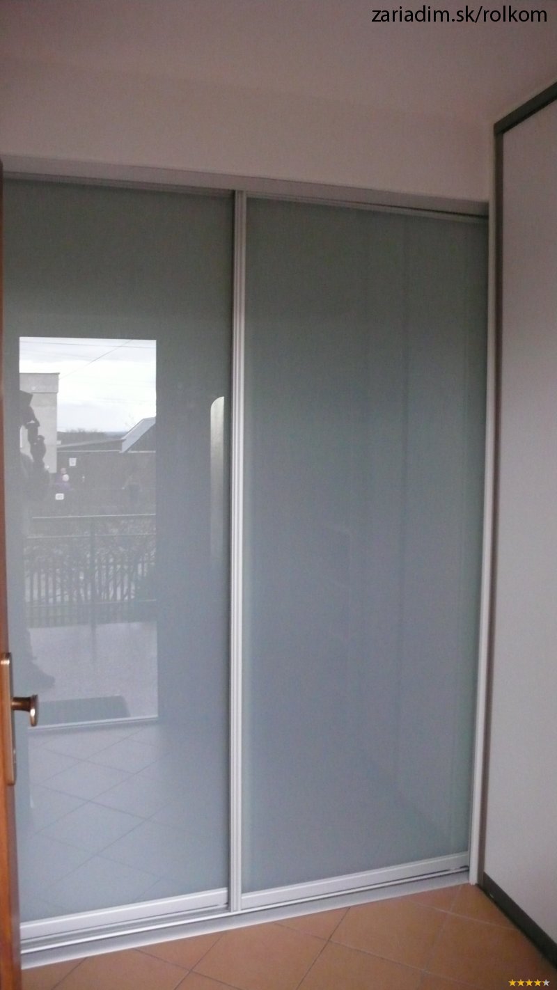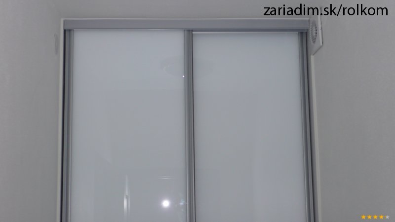 2. posuvné dvere o rozmere š 106 cm, v 80 cm. Použitý materiál Sklo Pure white 9003, rám oceľový Striebro.