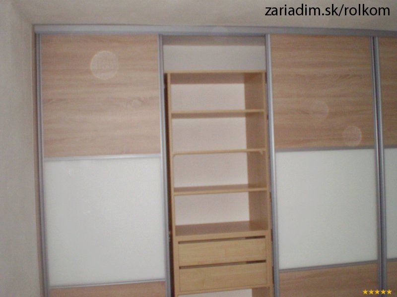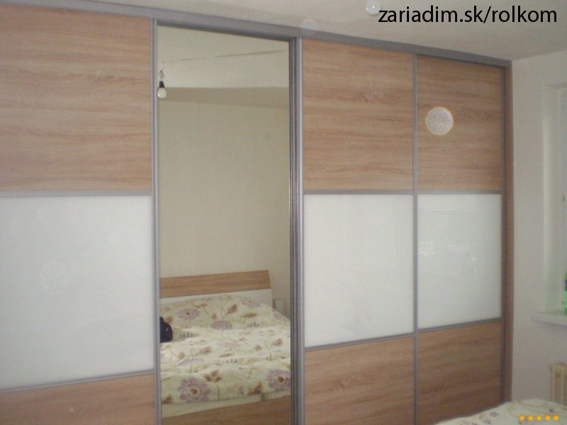 3. posuvné dvere o rozmere š 102 cm, v 125 cm. Použitý materiál Sklo Pure white 9003, Biela perlička, rám oceľový Striebro.