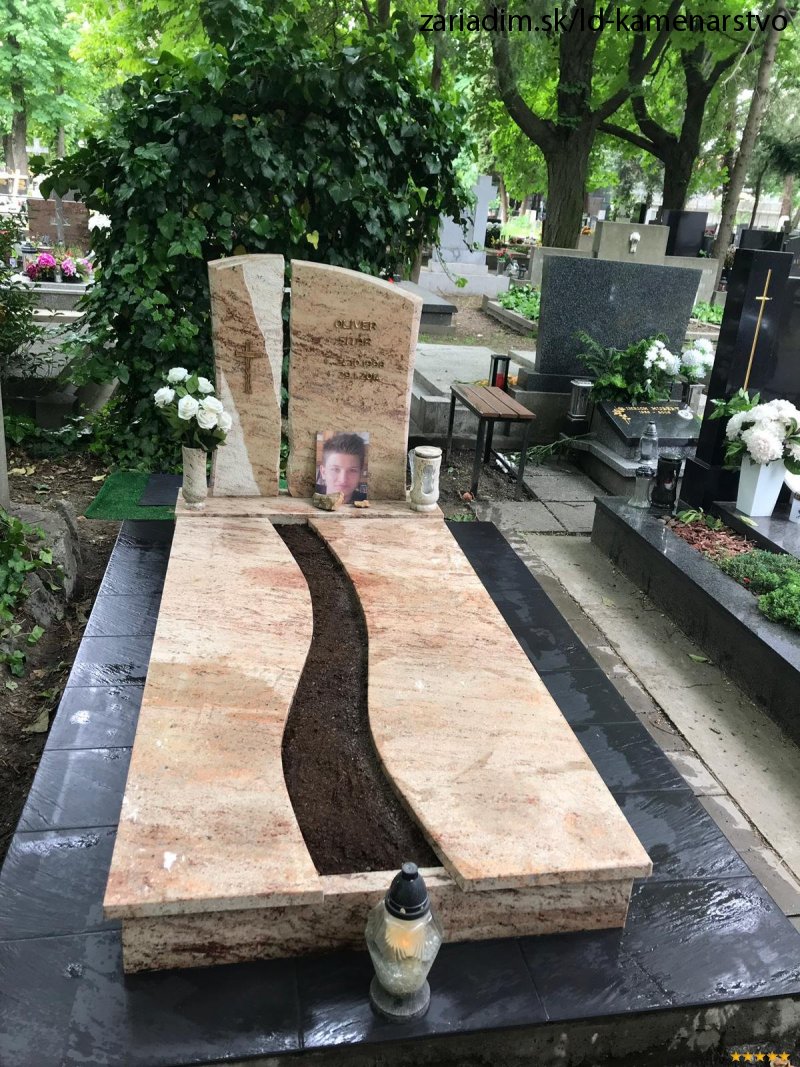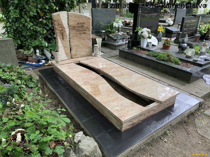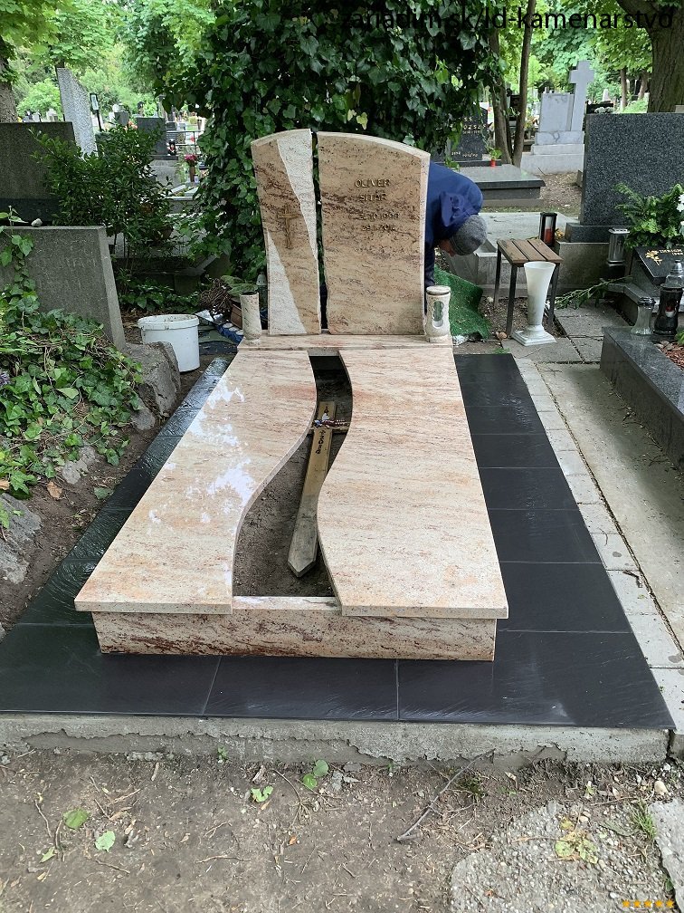 Kompletná výstavba Jednohrobu, materiál Shiwakashi, pomík lámaný a štokovaný, krycia doska delená s priestorom na kvetiny. Dlažba Rako čierna mrazuvzdorná exteriérová, písmo plastické vŕtané Caggiatti, lampáš a váza žulové Shiwakashi.