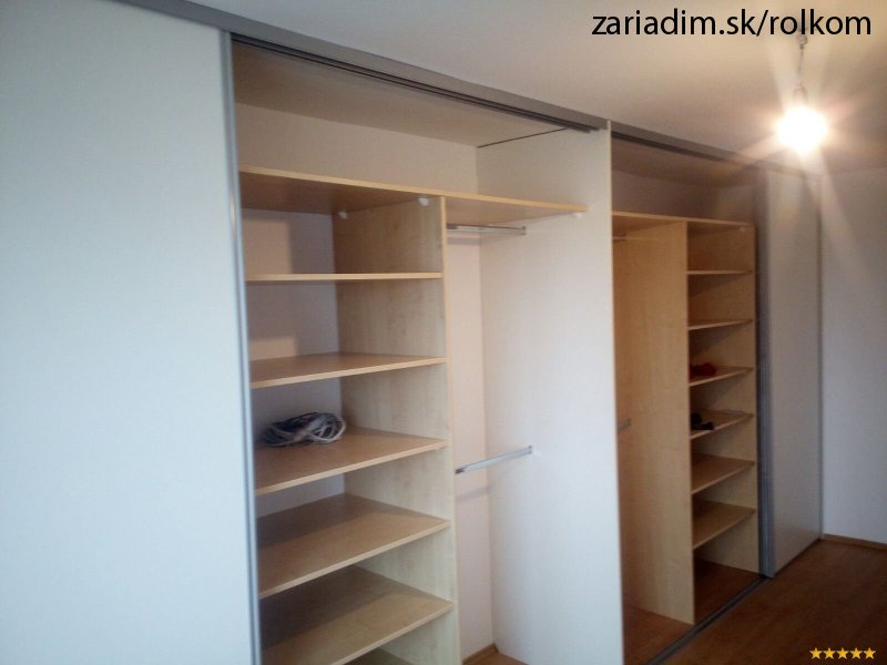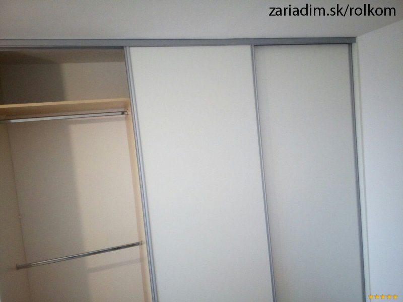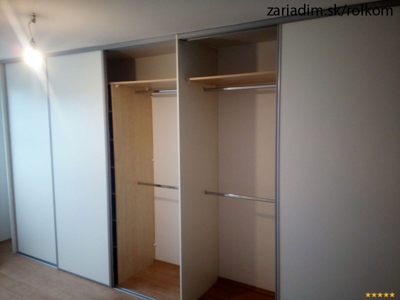 Skriňa o rozmere š 550 cm, v 258 cm, h 75 - 9 cm. Použitý materiál Biela perlička, Zrkadlo Strieborné, Javor a rám Oceľový Striebro.