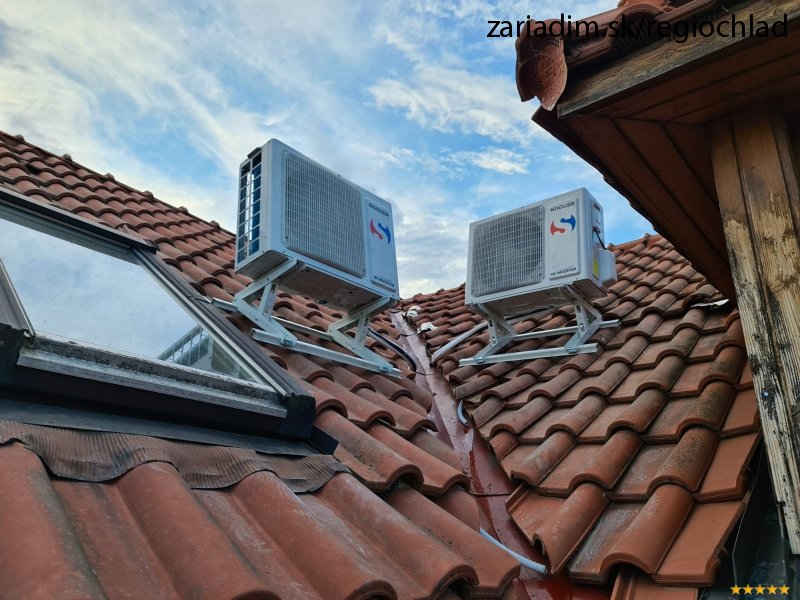 Dodanie a montáž dvoch starších modelov SINCLAIR RAY 3,5 kw v Piešťanoch. Montáž vonkajších jednotiek na šikmú strechu so sklonom 45°.